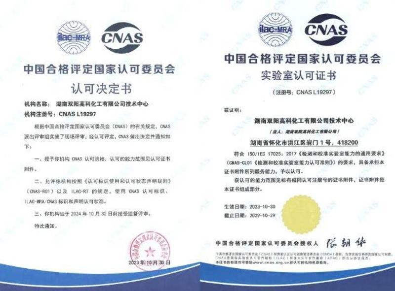 近日,湖南雙陽高科化工有限公司技術中心成功通過中國合格評定國家認可委員會(簡稱CNAS)的嚴格評審,并獲得CNAS實驗室認可證書。這標志著雙陽高科在實驗室硬件設施設備、檢測技術能力和管理水平等方面均已達到權威認可標準。